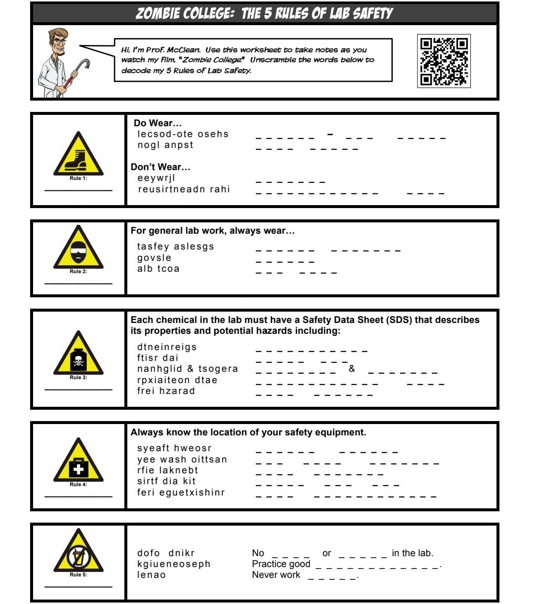 Use This Worksheet To Take Notes As You Watch My Film Zombie College Unscramble The Words Below To Decode My 5 Rules Of Lab Safety.